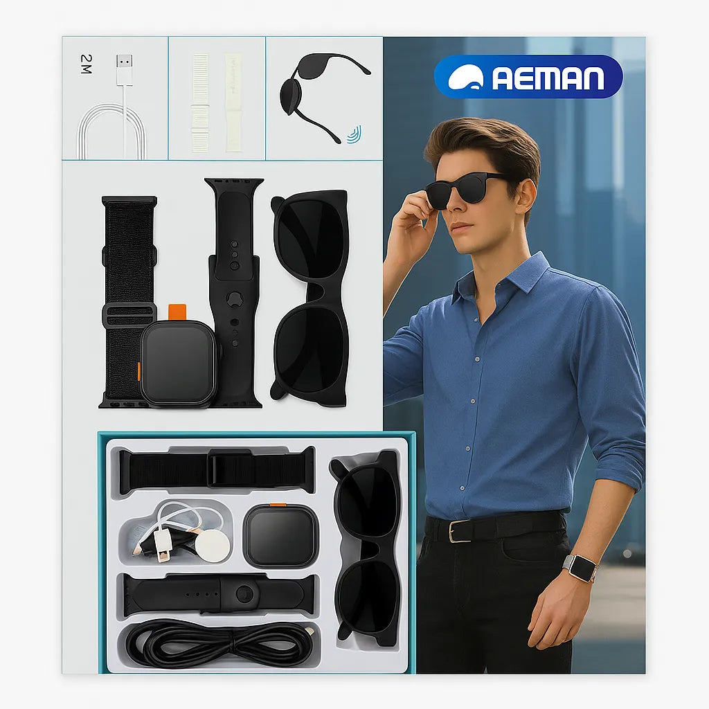 Experience smart style and everyday convenience with the AEMAI RM43 Smart Combo Set — a complete lifestyle bundle featuring a premium smartwatch, Bluetooth sunglasses, and all essential accessories. Designed for tech-savvy individuals who value both fashion and functionality, this set is your perfect daily companion.